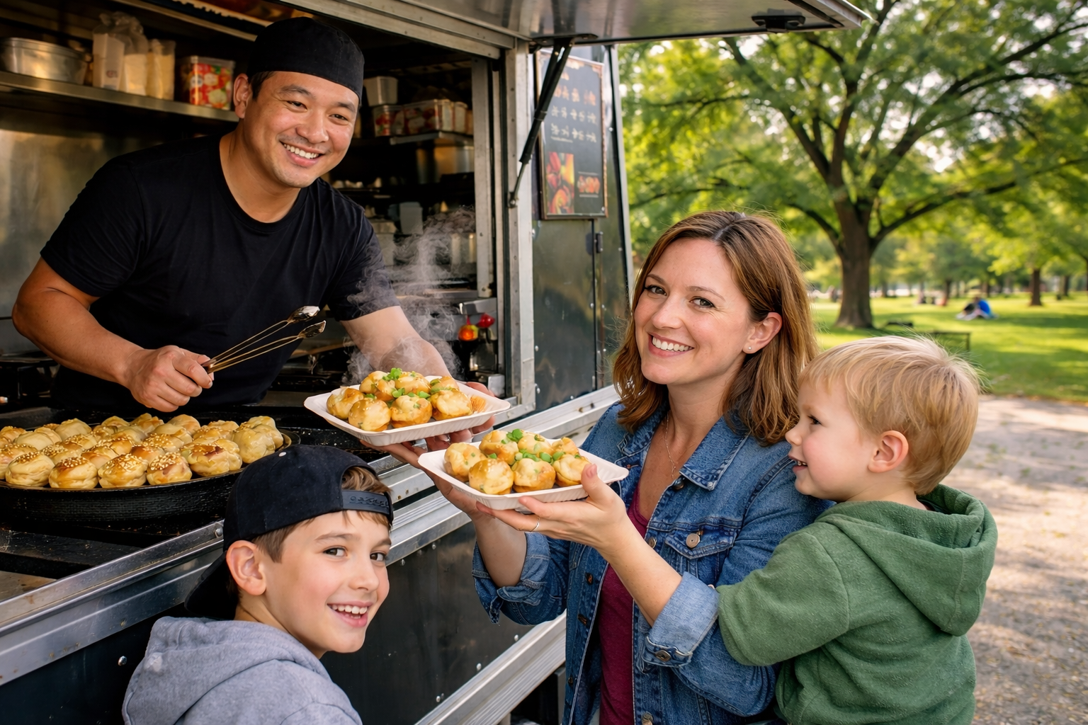 Rund um den Park reihen sich Foodtrucks und Marktstände aneinander. In den Küchen auf Rädern entstehen Gerichte aus vielen Teilen der Welt: würzige Burger, frisch gefüllte Wraps, süße Desserts und kleine Snacks für zwischendurch. Über dem Platz liegt der Duft von gegrillten Spezialitäten und frisch zubereiteten Speisen.