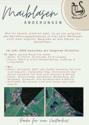 Die Musikkapelle Itter ist heuer wieder mit zwei Gruppen an zwei Tagen in Itter unterwegs, um herzliche Maigrüße zu überbringen.