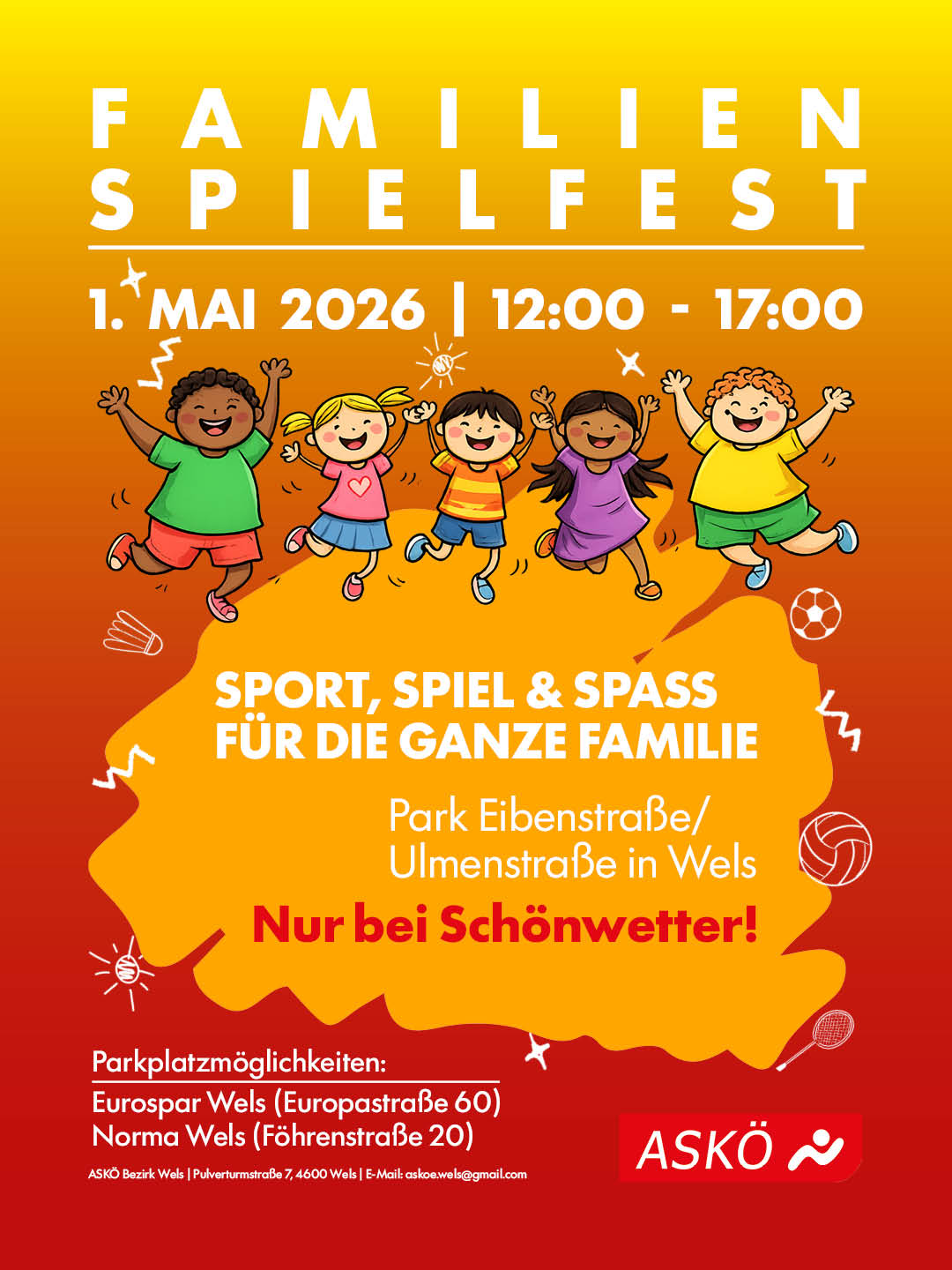 Das ASKÖ Familien-Spielfest bietet einen abwechslungsreichen Nachmittag für die ganze Familie. Im Mittelpunkt stehen Bewegung, Spiel und gemeinsames Erleben. Besucherinnen und Besucher erwartet ein vielfältiges Angebot an sportlichen Mitmachstationen und Spielmöglichkeiten für Kinder und Familien.