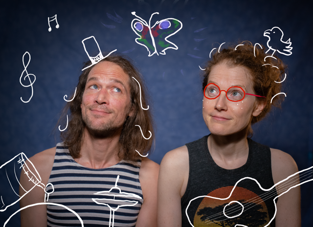 Das Linzer Liederduo spielt hausgemachte Songs für kleine und große Ohren. Hautnah, bunt und interaktiv! Mit im Gepäck: Gitarre, Schwimmbrille, Schlagzeug, Kochtopf, Ukulele, Bass und Sahnehäubchen. Sei dabei und schwing mit!