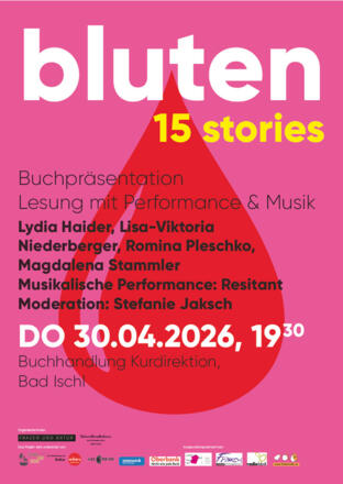 In Fortführung des Impulses der Europäischen Kulturhauptstadt 2025 positioniert sich Bad Ischl als Ort, an dem Kunst aktiv in gesellschaftliche Prozesse eingreift – wo das Poetische politisch wird und neue Räume für Dialog und Veränderung entstehen.In „bluten“ (hg. von Stefanie Jaksch und Magdalena Stammler) schreiben 15 Autorinnen über Alltag, Mutterschaft, Gewalt, Selbstbestimmung und Normabweichung. Die Lesung mit Lydia Haider, Lisa-Viktoria Niederberger, Romina Pleschko und Magdalena Stammler sowie eine musikalische Performance von Resitant machen deutlich: Die Themen der Ausstellung setzen sich im Körper fort – im Erleben, im Erzählen und im Widerstand.