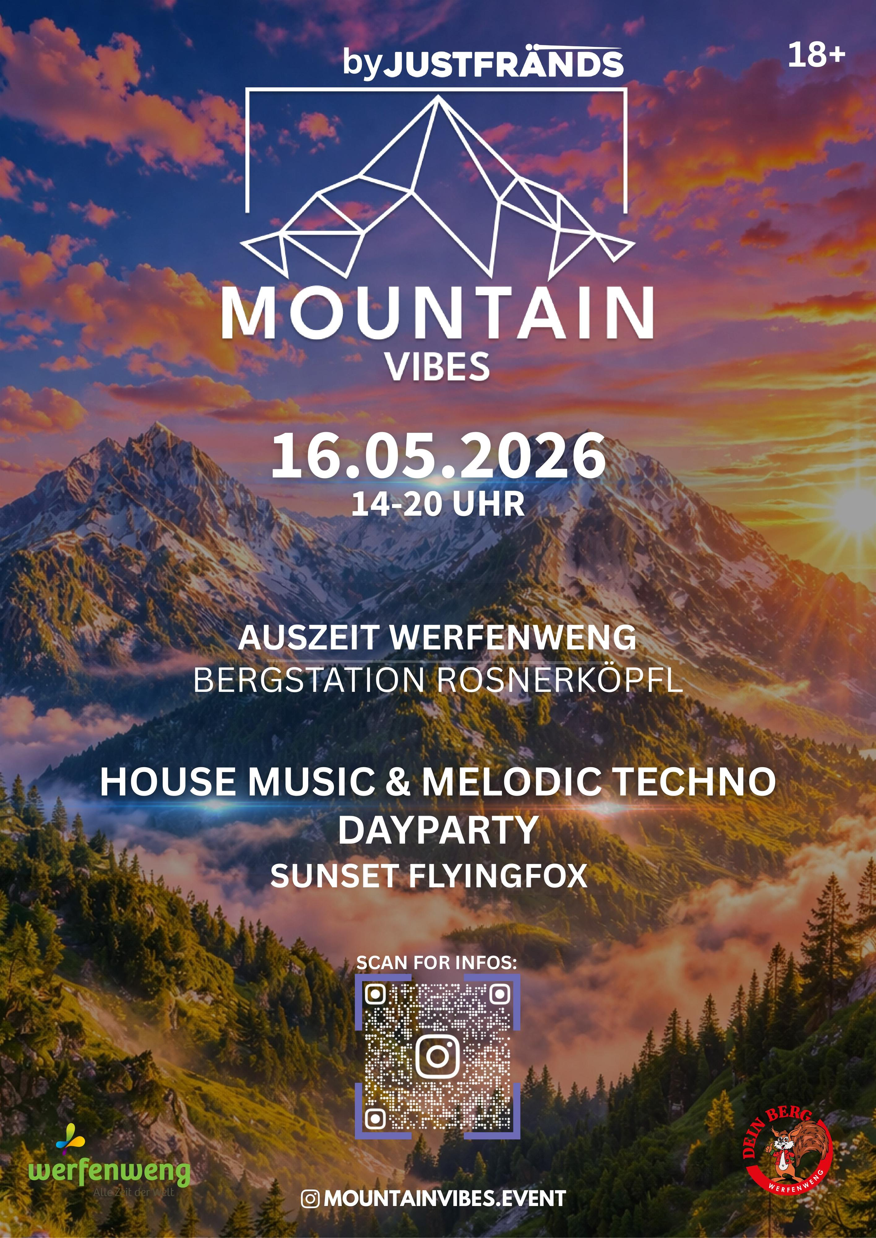 Am 16. Mai feiert Mountain Vibes by Justfränds ihre erste Dayparty in Werfenweng - mit House Music & Melodic Techno, spektakulärer Aussicht und einer Atmosphäre, die man nicht erklären kann - nur fühlen.